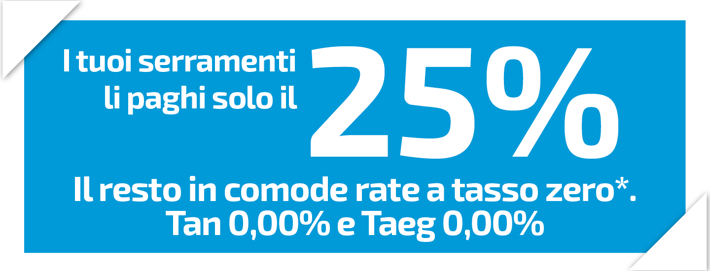 Paga subito solo il 25%. Versa un anticipo del 25% e rateizza il restante 75% a tasso zero, in 60 o 120 mesi*.